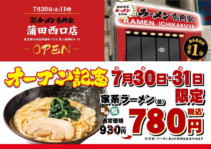株式会社ガーデン(本社:東京都新宿区 代表取締役社長:川島賢 以下「当社」)が運営する「壱角家」は、「壱角家 蒲田西口店」を2025年7月30日(水)にオープンいたします。「壱角家 蒲田西口店」ではオープンを記念して、2025年7月30日(水)、7月31日(木)の2日間限定で「ラーメン並(醤油/塩)」を税込 780 円で提供いたします。