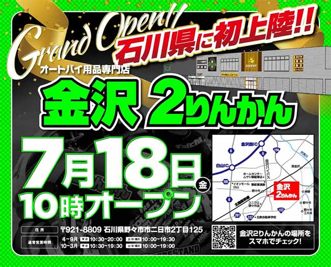 オートバイ用品専門店「2りんかん」を展開する株式会社2りんかんイエローハットは、石川県野々市市に「金沢2りんかん」をオープンいたします