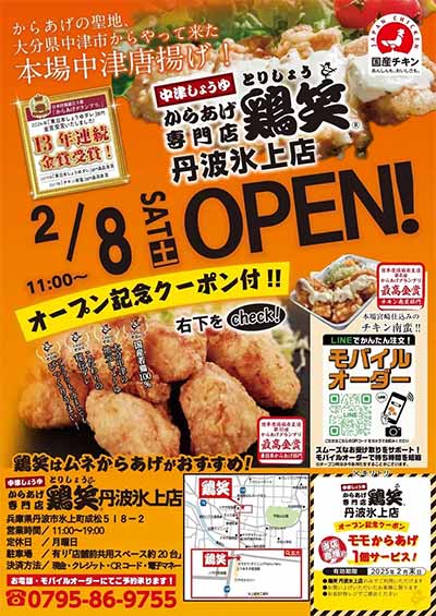SRSグループである株式会社NIS(本社:大阪府大阪市、代表取締役社長 岩見貴史)は、からあげテイクアウト専門店「鶏笑 丹波氷上治(たんばひかみ)店」を2025年2月8日(土)に兵庫県丹波市にオープンいたします。